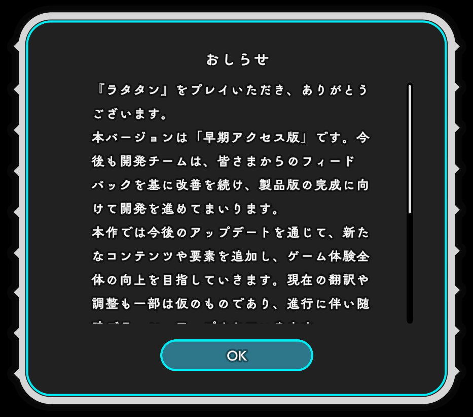 因みにプレイ開始画面からフィードバックを送ることが出来ますので、一緒にラタタンを良いゲームになるようにご意見送っていきましょう